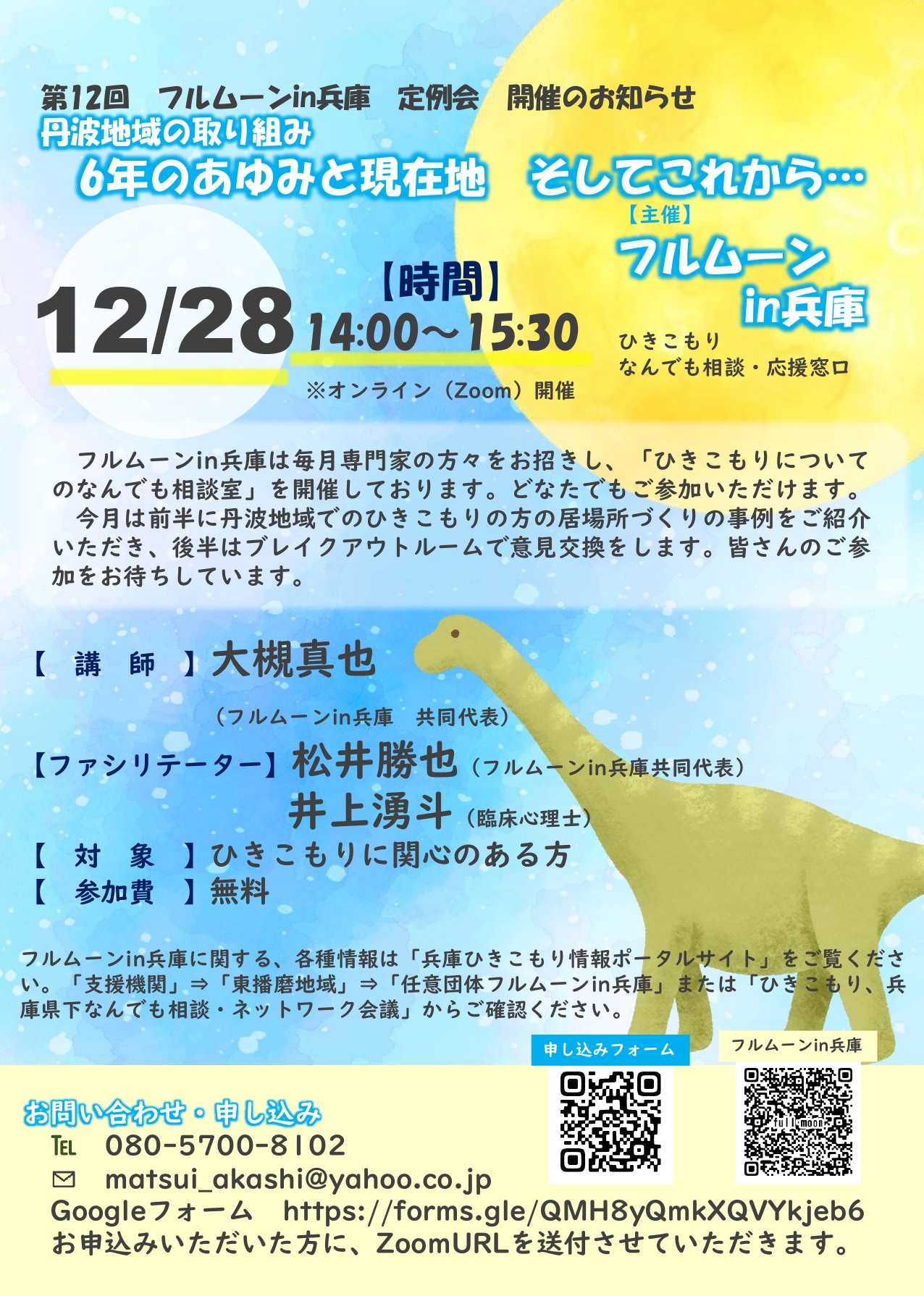 | 開催予定日 | 毎月1回開催。基本は日曜日の14時から15時半 ※実施内容により変動あり 【開催予定】 日 時:12月28日(日)14:00~15:30 テーマ:「丹波地域の取り組み 6年のあゆみと現在地 そしてこれから…」 講師:大槻真也(フルムーンin兵庫共同代表) ファシリテータ―:松井勝也(フルムーンin兵庫共同代表) 井上湧斗(臨床心理士) 内 容:フルムーンin兵庫は毎月専門家の方々をお招きし、「ひきこもりについてのなんでも相談室」を開催しております。ひきこもりに関心のある方はどなたでもご参加いただけます。お気軽にご参加ください。今月は「丹波地域のひきこもり支援」の事例をご紹介し、後半はブレイクアウトルームで交流します。皆さんのご参加をお待ちしています。 【連絡先】(守秘義務厳守・匿名可) E-mail: matsui_akashi@yahoo.co.jp 電 話:080-5700-8102(松井) 対 象:兵庫県下家族会・当事者・各支援団体・ひきこもりに関心の高い方 参加費:無料 | |