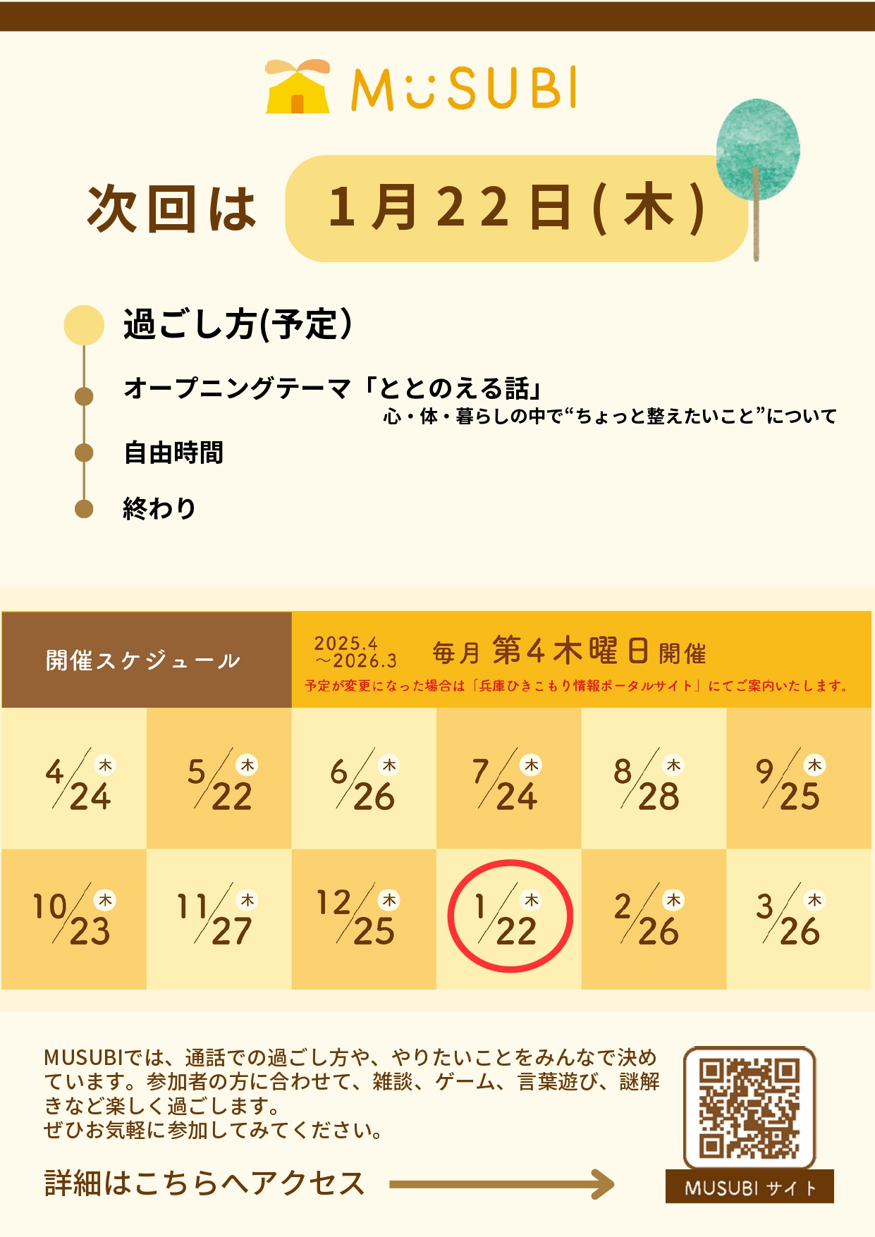 | 開催予定日 | 毎月第4木曜日13:30~15:00開催 ①4月24日(木)、②5月22日(木)、③6月26日(木) ④7月24日(木)、⑤8月28日(木)、⑥9月25日(木) ⑦10月23日(木)、⑧11月27日(木)、⑨12月25日(木) ⑩1月22日(木)、⑪2月26日(木)、⑫3月26日(木) 【次回開催】 日時:1月22日(木)13:30~15:00 オープニングテーマ:ととのえる話 心・体・暮らしの中で“ちょっと整えたいこと”について | |