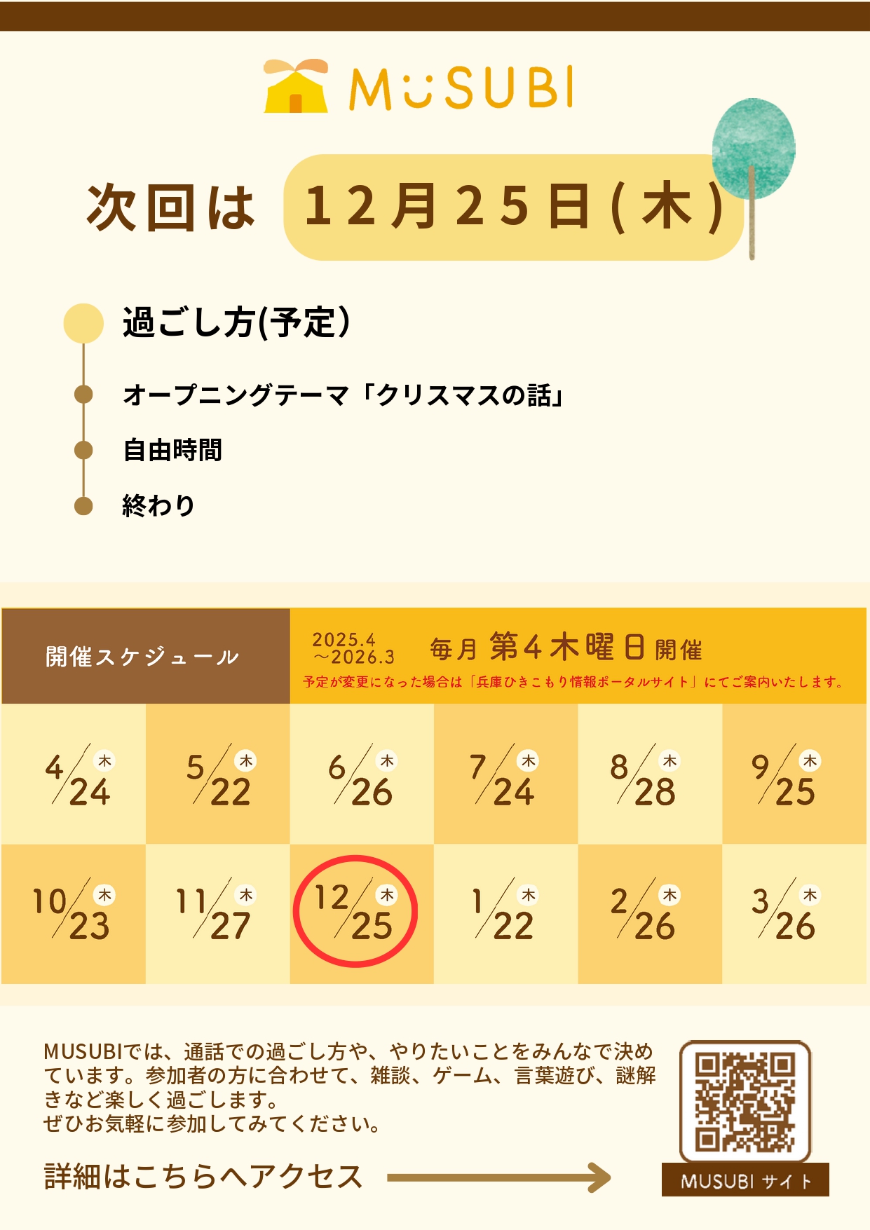 | 開催予定日 | 毎月第4木曜日13:30~15:00開催 ①4月24日(木)、②5月22日(木)、③6月26日(木) ④7月24日(木)、⑤8月28日(木)、⑥9月25日(木) ⑦10月23日(木)、⑧11月27日(木)、⑨12月25日(木) ⑩1月22日(木)、⑪2月26日(木)、⑫3月26日(木) 【次回開催】 日時:12月25日(木)13:30~15:00 オープニングテーマ:クリスマスの話 | |